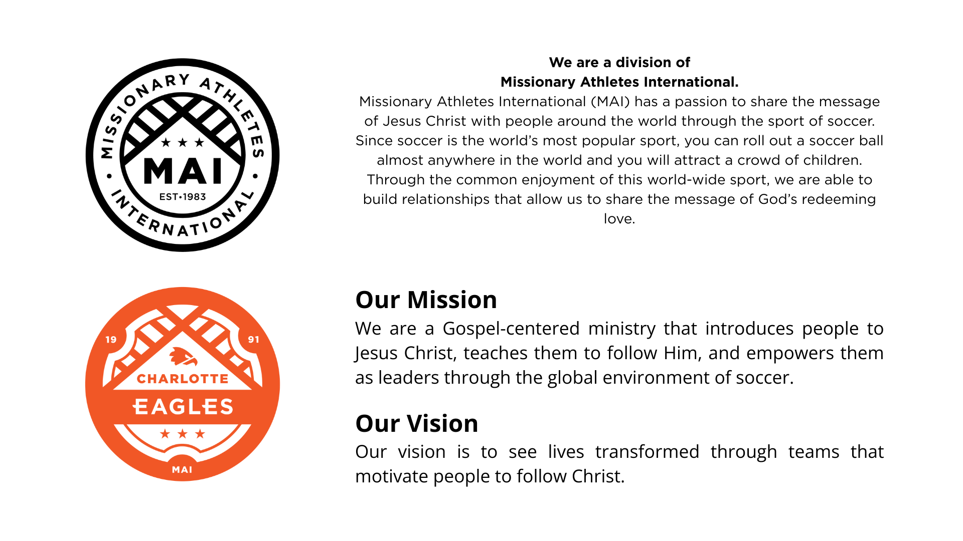 Missionary Athletes International is a nonprofit organization exempt from federal income tax under section 501(c)(3) of the Internal Revenue Code. Missionary Athletes International (MAI) began in 1983 and is a member of the Evangelical Council for Financial Accountability (ECFA). Contributions are solicited with the understanding that Missionary Athletes International has complete discretion and control over the use of all donated funds.