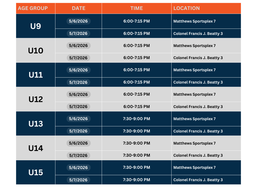 May 6, 2026 | 6:00-7:15 PM | Matthews Sportsplex 7