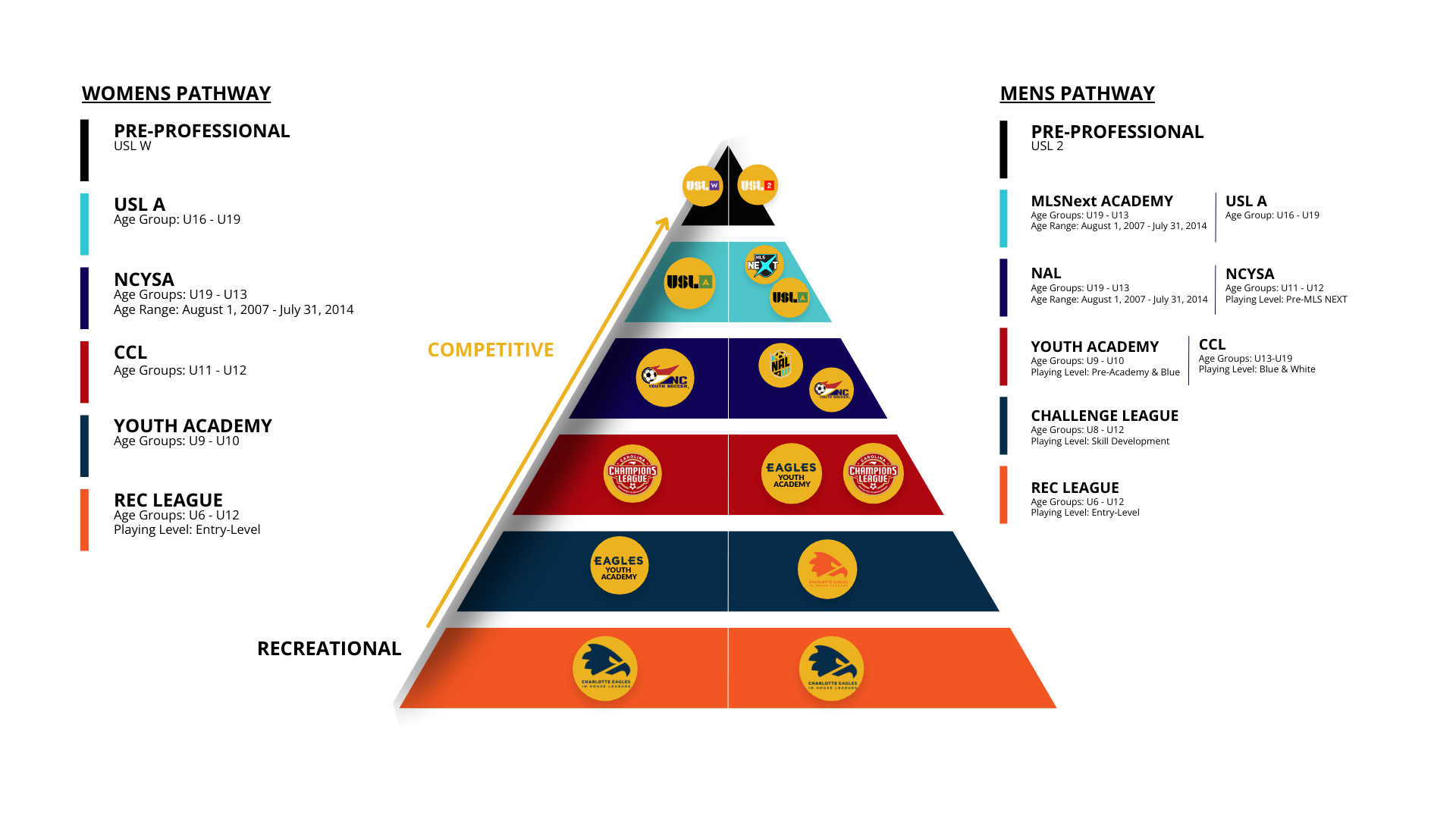 Our coaches strive to ensure players develop technically, tactically, physically, and mentally. We provide the opportunity for each of our athletes to follow our player development pathway, with the potential of playing with our program from our Rec league all the way through to pre-professional level soccer.